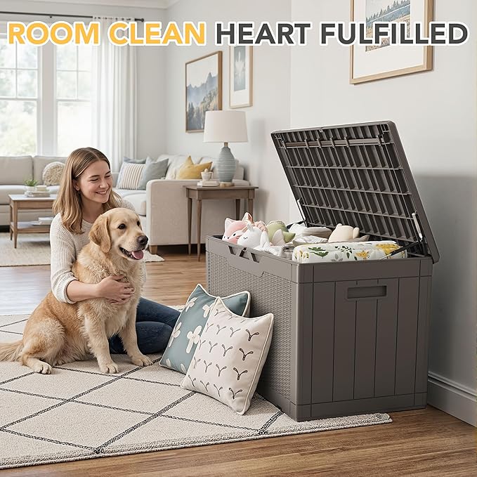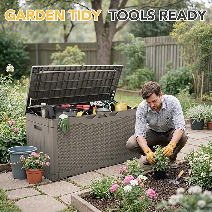 - WIDE VERSATILITY: The 100 gallon storage box can not only help you organize your patio or lawn. It can also be used as a table or bench when you need it, and the lid is equipped with a support bar inside, which can greatly enhance the stability and weight-bearing capacity of the storage box.