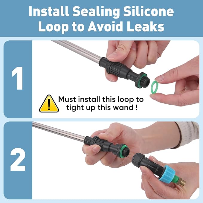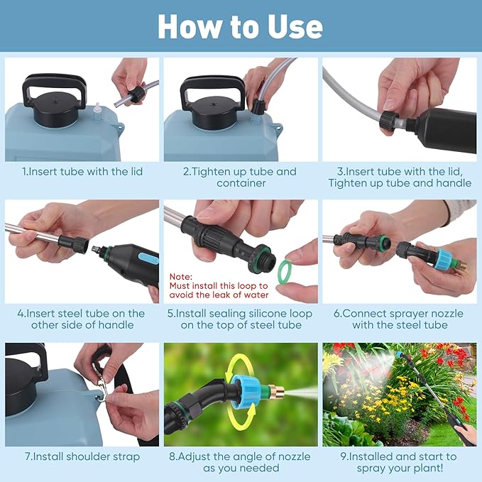 - 【How to Install & Use】Note: When you find sprayer is leaking,please check to make sure to install green silicone loop on the top of steel tube. This is an important step and help avoid the leak of water. Red light when charging, blue light when fully charged, no light when no power. Green light when in use. Our sprayer is equipped with a charging cable. Please make sure to use a matching charger to avoid failure to charge due to a mismatched charger
