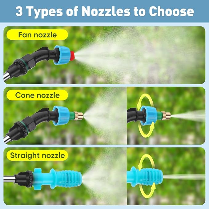 - 【3 Adjustable Nozzles】-The battery powered sprayer comes with 3 versatile nozzles: wide fan-shaped nozzle, shower-shaped nozzle, and brass nozzle.You can easily adjust the lawn water spray intensity by rotating the nozzle, adjusting fine mist or fan mist, direct mist as you want! Whether you are home gardening enthusiast or professional gardener, this battery operated sprayer is the good choice for your gardening work. Water fully at any time, angle, or location, depending on your usage needs.
