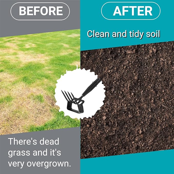 - Dual-head design: one side is a sharp four-tooth rake head design, which can loosen the soil efficiently without harming the plant root system, and the other side is a sharp blade design, which can easily eliminate weeds.