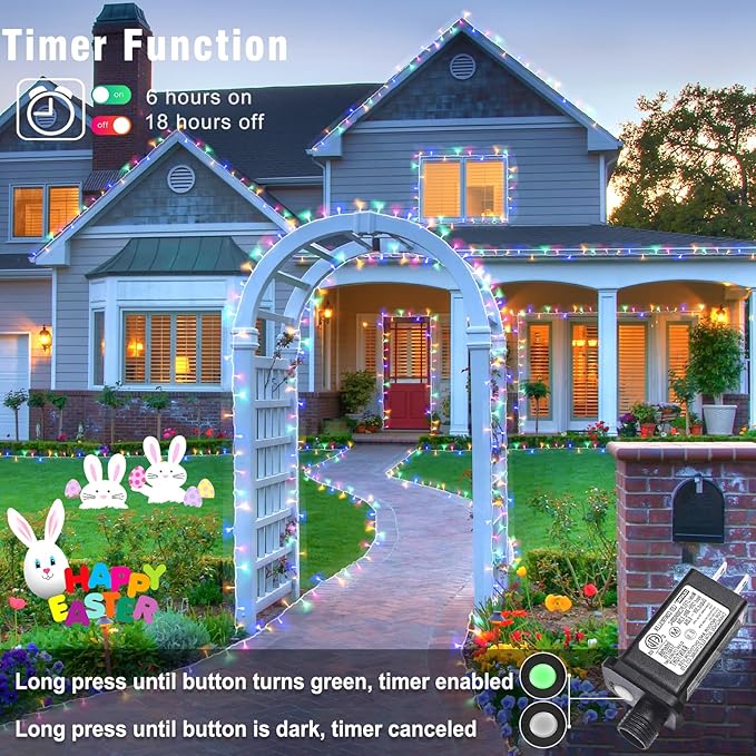 - Timer and Memory Function: Our led Christmas lights feature timer settings, press and hold the button on the adapter until the button turns green and the timer is activated, 6 hours on and off for 18 hours per day. Additionally, the Christmas lights built- in memory chip save your last lighting modes and timer setup, so no need to set it every time.