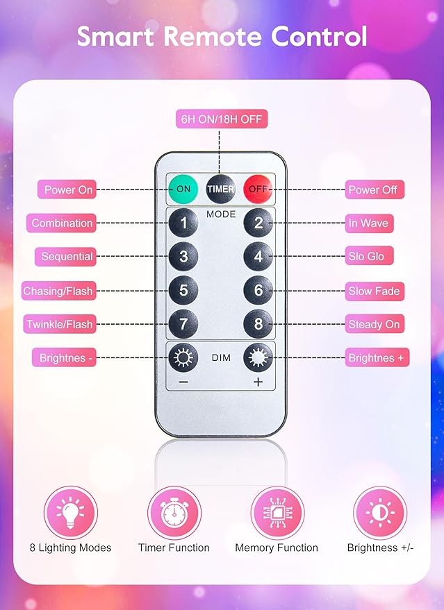 - Timer and Memory Function: The lights are equipped with a convenient timer function that sets them to turn on for 6 hours and turn off for 18 hours