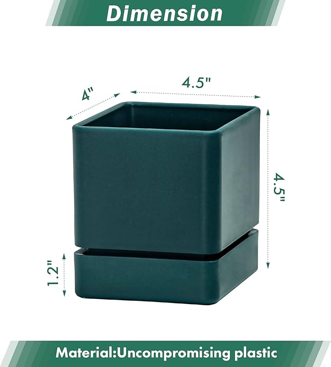 4 Inch Herb Planter Pot, Plastic Planter with Drainage Holes and Saucer, Modern Decorative Gardening Pot for Indoor Plants, Flowers, Herbs, Succulents, Green, Set of 1, 76-Y-C-1