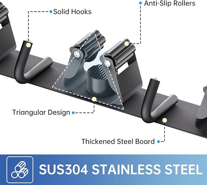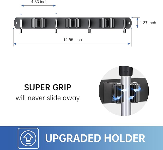 - 🏡【NON-SLIDE DESIGN】Each rack of the broom and mop holder wall mounted features an adjustable triangular design. The spring-loaded, double rubber gripped slots can keep a stronger hold on your items with diameter of 0.7 inch-1.3 inch. Whether wet mops or baseball bats, nothing slips.