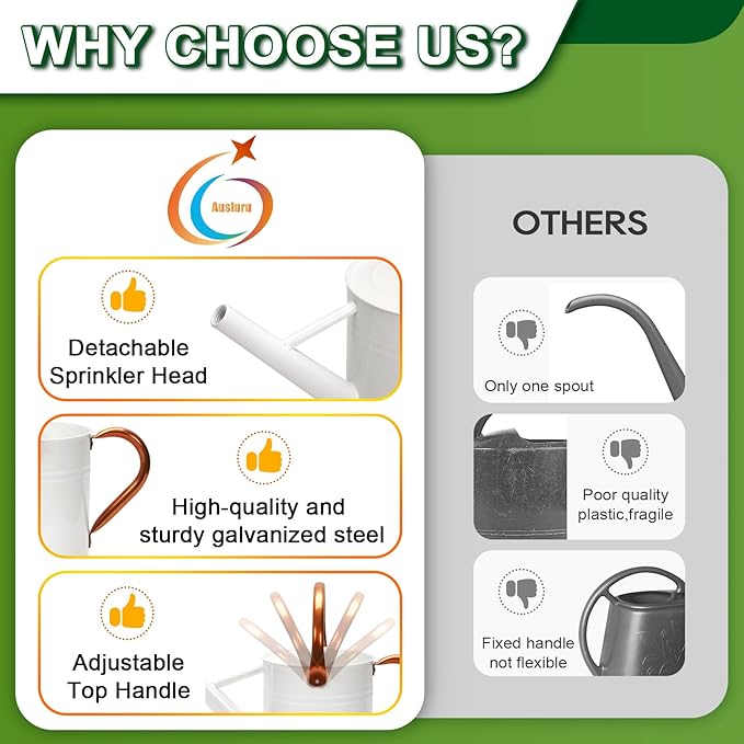 - Stylish and Functional: Whether you're a seasoned gardener or just starting out, this 1-gallon metal watering can is a stylish and functional addition to your gardening arsenal. Its elegant design and high-quality construction make it perfect for both indoor and outdoor use, simplifying the task of watering your plants.