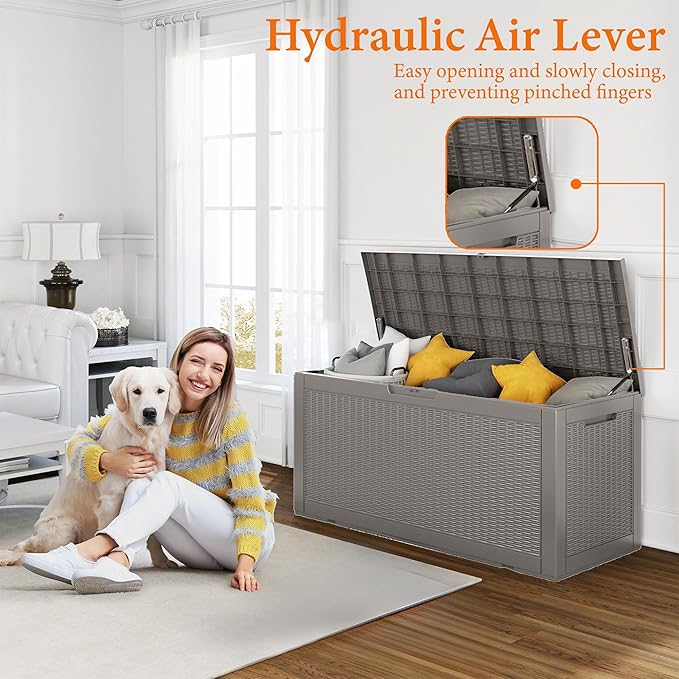 - VERSATILE IN EVERY SETTING: This patio storage box doubles as an indoor laundry organizer and an outdoor yard storage unit for cushions, garden tools, pool accessories, outdoor gear, and more, offering ample space. It can also serve as a side table, patio seat, storage bench, or footstool