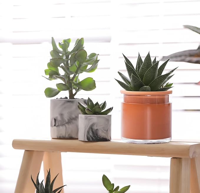 - Terracotta + Glass: Elegant modern design self watering plants pot with ingenious natural breathable terra cotta material and clear glass container. See the water surplus just from a glance.