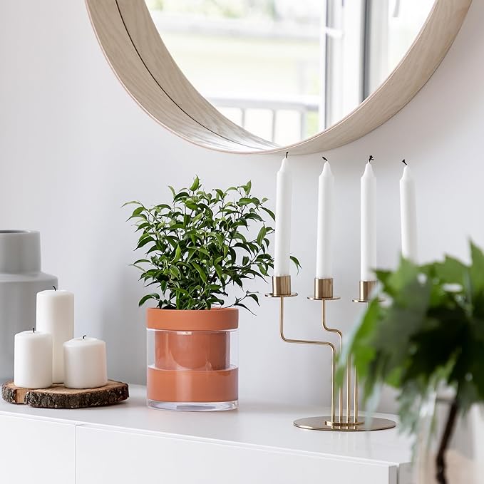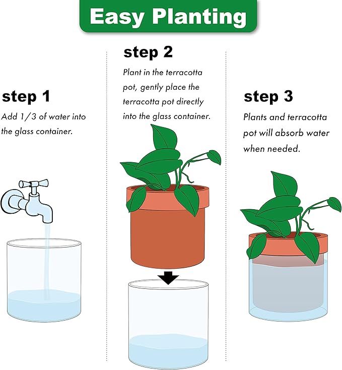 - Self-watering System: The terracotta pot is unglazed, just fill the glass container with water to ensure plants will absorb only what they need through the terracotta pot walls.