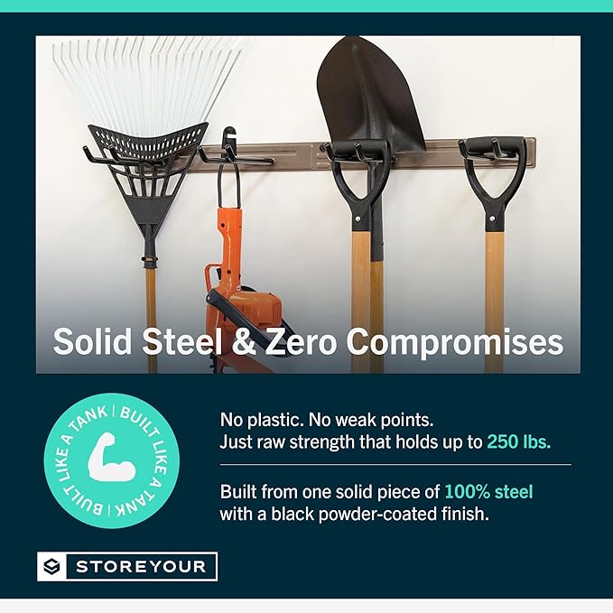 - ULTRA-STRONG & BUILT TO LAST – Made from 100% solid steel with no plastic parts or assembly required, this tool rack is crafted to withstand heavy-duty use. Each wall-mounted storage rack arrives fully welded and powder-coated to resist rust and corrosion. Perfect for organizing tools, outdoor storage gear, or even a fishing pole rack for the garage.