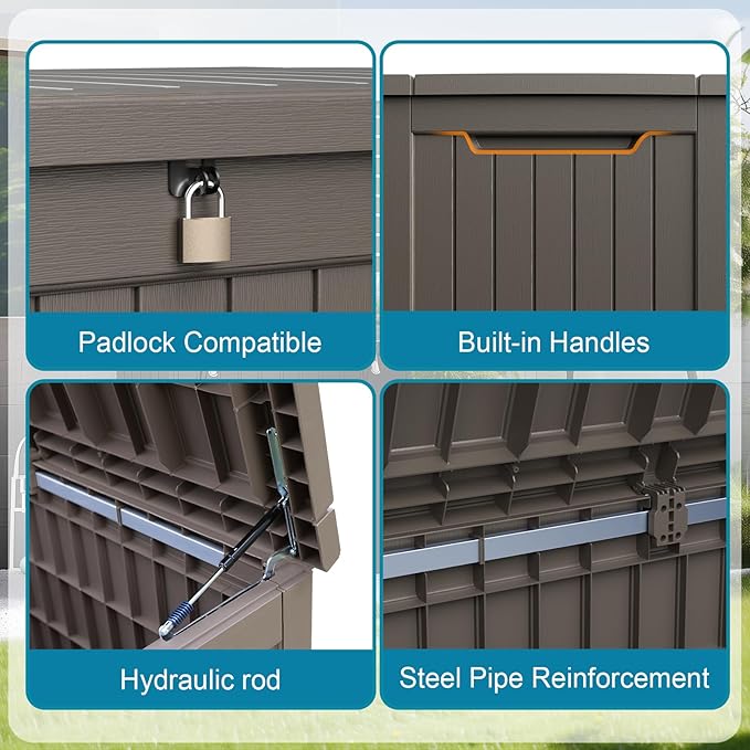 - CONVENIENT DESIGN: Our deck storage box features built-in handles on both sides for easy lifting and mobility. Additionally, you can enhance security by adding a password lock/small lock (not included) to the top cover