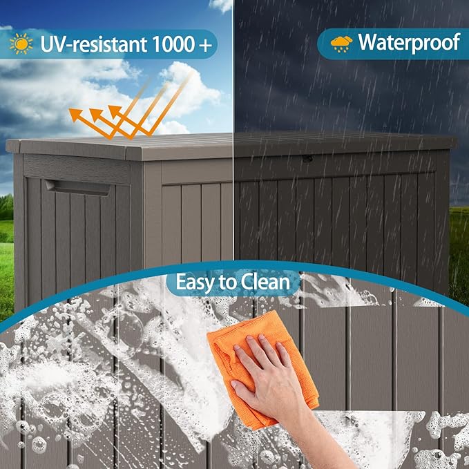 - ALL-WEATHER PROTECTION: The wind and rain-resistant aggregate resin with a wood grain pattern combines aesthetics and practicality, providing this deck boxes outdoor waterproof, UV-resistant, fade-resistant, and warp-resistant protection. Almost maintenance-free for years to come