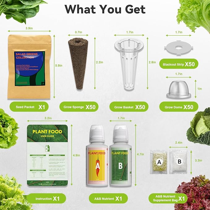 - 【All-IN-ONE Home Garden】These hydroponic pods provide everything you'll need to start your indoor herb garden. 7 types of 350+ organic salad seeds, 50 growing sponges, growing baskets, growing domes and pod labels, 200ml A&B plant food. It's suitable for both beginners and experienced gardeners