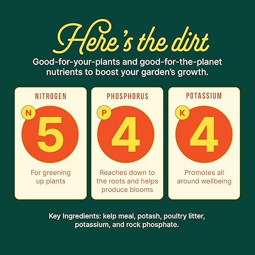 - IDEAL FOR VEGGIES: All plants need nitrogen, phosphorus, and potassium to grow. We’ve carefully crafted our fertilizer with the perfect ratio to help your plants thrive. Our phosphate-rich fertilizer 5-4-5 NPK mix promotes abundant fruiting!