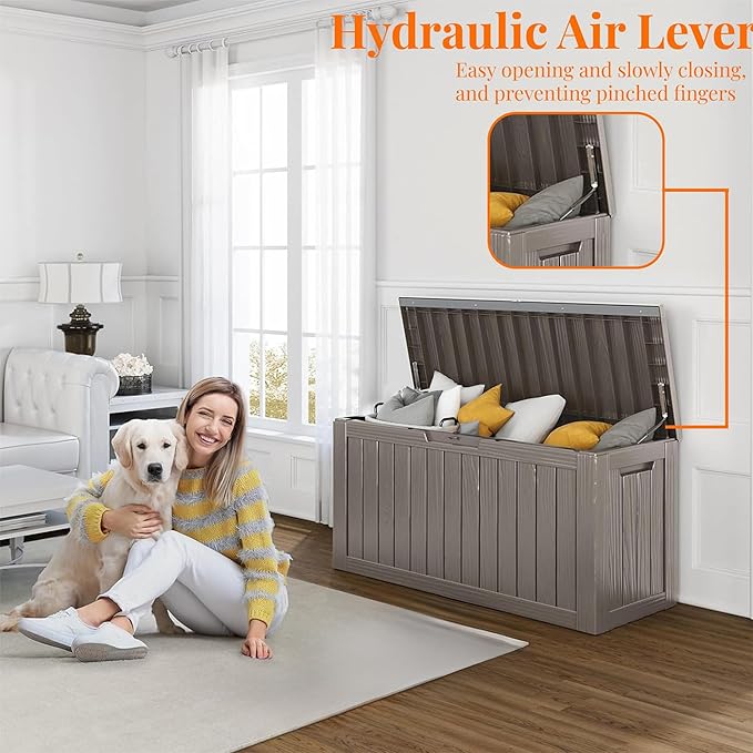 - VERSATILE IN EVERY SETTING: This patio storage box doubles as an indoor laundry organizer and an outdoor yard storage unit for cushions, garden tools, pool accessories, outdoor gear, and more, offering ample space. It can also serve as a side table, patio seat, storage bench, or footstool