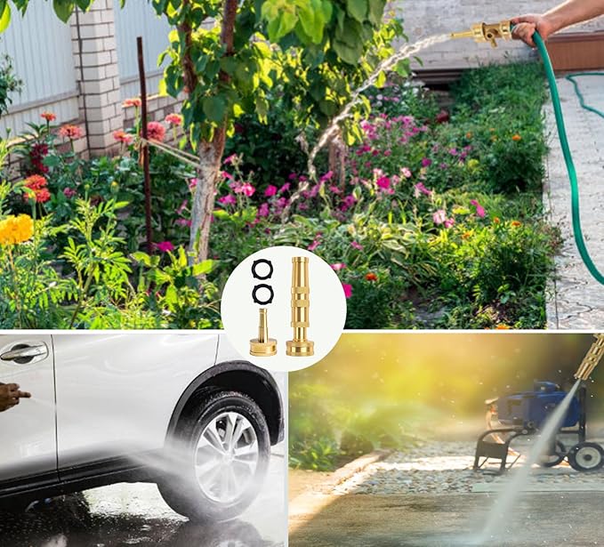 - Solid Brass Material:This hose nozzle crafted from heavy-duty solid brass construction, withstands high pressure, making it ideal for various outdoor tasks such as gardening, car washing, deck, siding & driveway cleaning, and more.