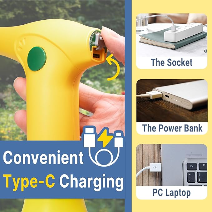 - 【Rechargeable & Last Long】This electric sprayer bottle comes with a Type-C USB cable but CHARGER IS NOT INCLUDED. The charge port hidden on the handle is well covered for watering-proof consideration. Charging the battery to full will last this electric plant sprayer working for a long time.