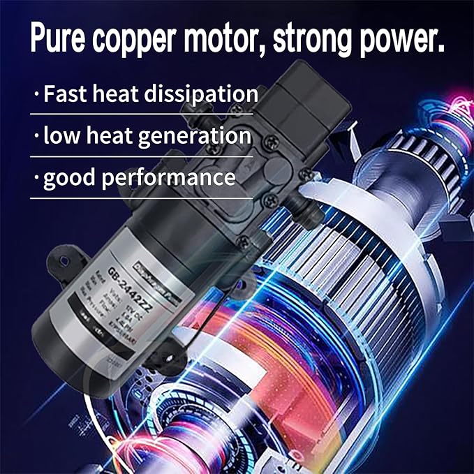 - DC 12V diaphragm water pump flow rate of 4.5L/min 1.2GPM,Self-priming vertical pumping: 6.6 ft (2m),Pure copper motor runs stably and works with low noise