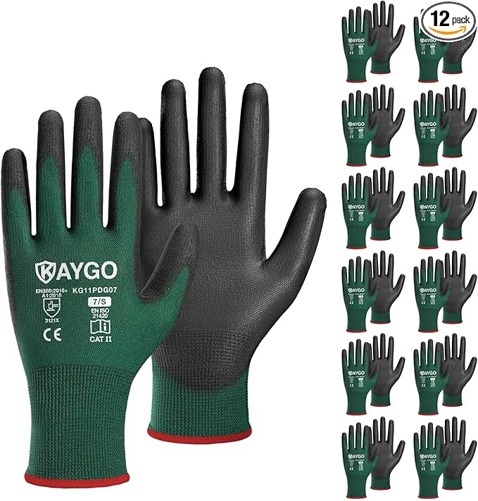KAYGO Safety Work Gloves PU Coated,12 Pairs KG11PB Seamless Knit Glove for Men and Women, with Smooth Grip on Palm and Fingers, Ideal for General Duty Work (Small,Dark Green)