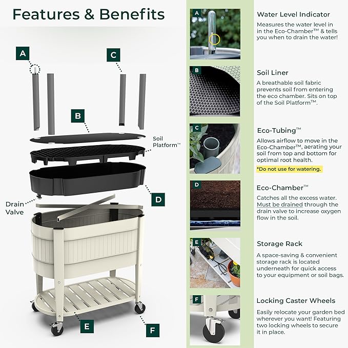 - PATENTED TECHNOLOGY: The Soil Platform elevates and supports the soil above the Eco-Chamber, ensuring it never comes into contact with standing water, eliminating soggy soil and promoting healthier roots. To keep everything in place, the included Soil Fabric rests on the platform, preventing soil from falling into the chamber below.