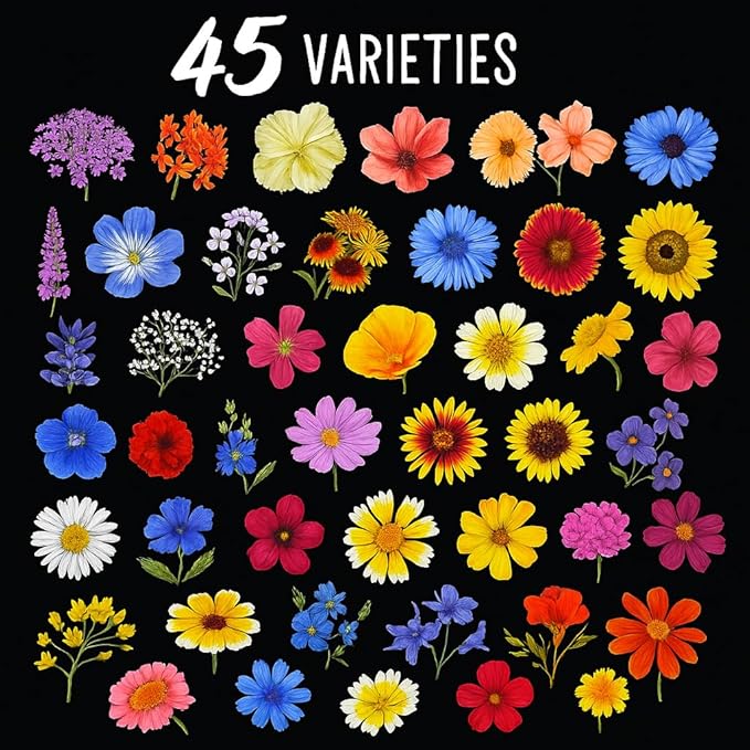 - PURE, HEIRLOOM VARIETIES: The 100,000 seeds in the package come from 45 time-tested wildflower strains selected to thrive naturally with no need for pesticides, herbicides or other synthetic treatments.