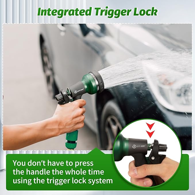 - Labor-Saving Design: AUTOMAN garden nozzle features a nice lock bar at the top of the handle that keeps the water remains on without you having to apply any pressure.Just use the lock so you don't have to keep your hand holding it the whole time.