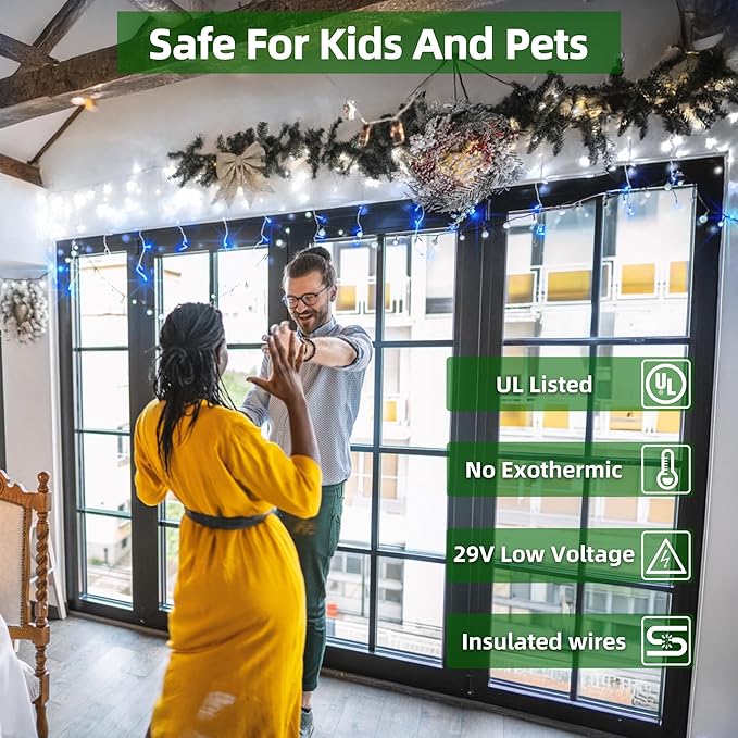 - Safe, Certified, and Long-Lasting: Designed with 29V low voltage for maximum safety, these lights are far below the standard voltage, ensuring they remain cool to the touch, even after hours of use. Perfect for homes with children and pets, these lights are also ULtest, meeting the highest safety standards. The LED christmas lights bulbs offer an incredible 50,000 hours of lifespan, providing years of beautiful, worry-free lighting without the need for replacements