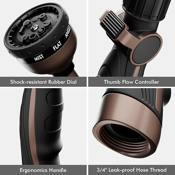 - 【Heavy Duty Metal Watering Wand】Constructed with premium zinc-alloy material, this 15-inch hose wand sprayer is solid & strong to resist daily drops and shocks. The bronze powder painting, TPU coating and rubberized bezel dial can enhance durability & flexibility and withstand hard impacts & heavy force. A long-lasting garden hose wand you can count on many years.