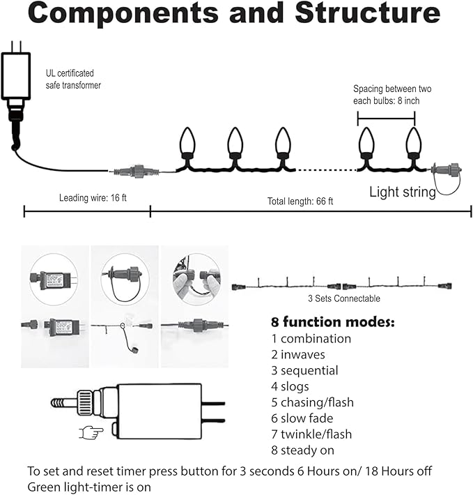 - 8 MODES WITH TIMER: This C9 Christmas string lights offer 8 distinctive lighting modes, including a combination, wave, sequential, slow glow, chasing/flash, slow fade, twinkle/flash, and steady on.(NOTE:Long-time press the button on the adapter, when shows green lights, timer works.)