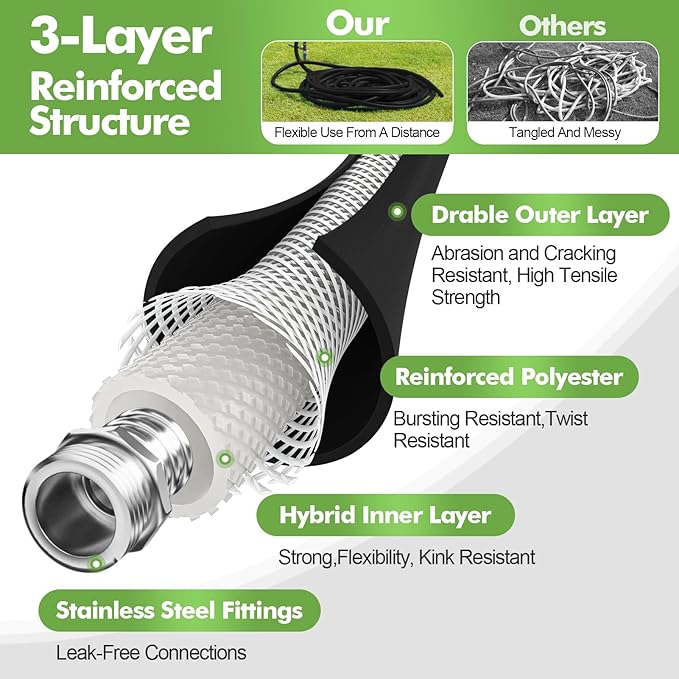 - Durable Construction:Expertly developed hybrid material from rubber and polymer, 3-Layer reinforced structural rubber hose is extremely tough. The 50 ft garden hose ends are made of 100% stainless steel fittings and screw core, effectively prevent rust and leakage. NOTE: 5/8” refers to the black hose diameter, not the fittings’ outlet
