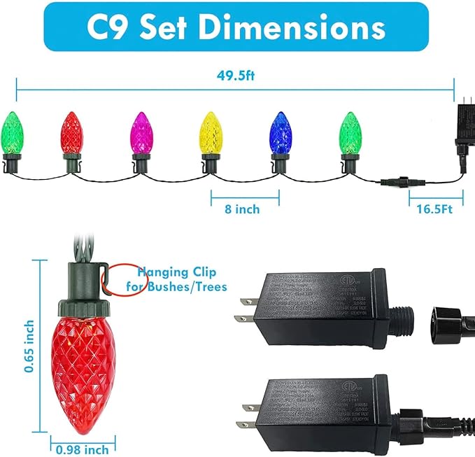 - Guarantee & Service: The package includes two C9 string lights and plugs. If you have any questions or concern, please fell free to message us, we also welcome any inquires before purchase. We promise to reply to you within 24 hours.