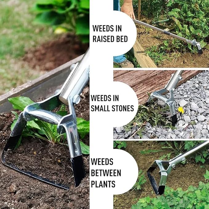 - This action hoe weeder tool with triangular-shaped steel blade-head that slightly oscillates back and forth and simple push and pull action will not only highly effective weeding without disturbing developing plant roots,but also will be able to save half the time of weeder by hand.