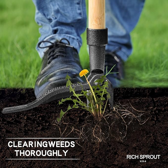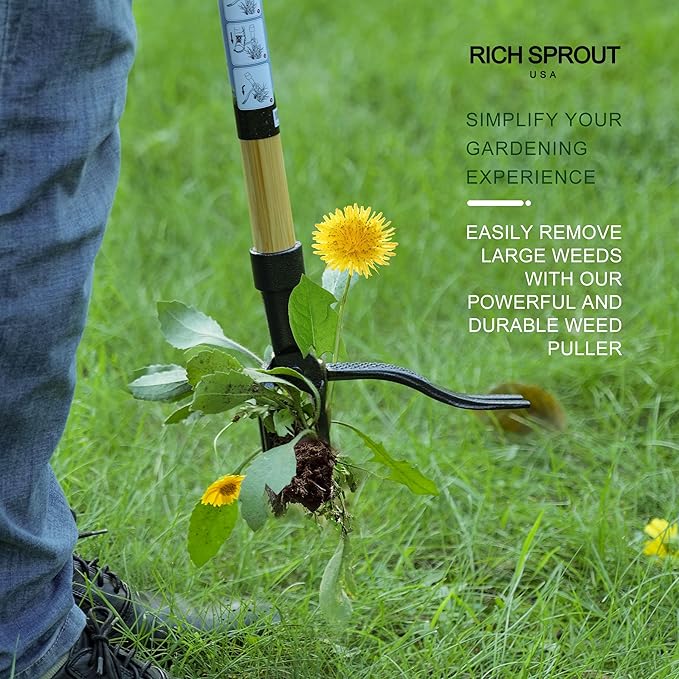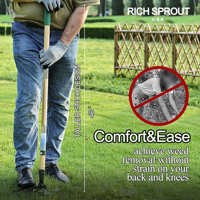 - 【No More Bending】: The Rich Sprout long-handle weed puller allows you to pull weeds without bending, reducing strain on your knees and back, making weeding a more comfortable experience. Featuring a 46″ tall comfortable real bamboo handle, it easily removes weeds without causing any strain