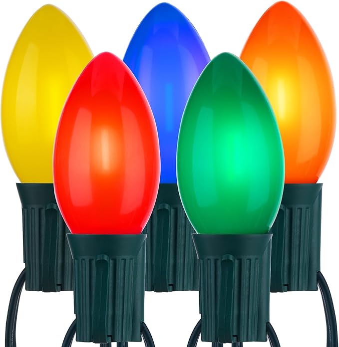 - Extra-Long 50 Feet C9 Christmas Lights Outdoor: This green wire 50-foot string features 50 C9 LED frosted color bulbs. The LED C9 bulbs offer superior structure, unmatched color saturation, durability, and reliability. They are dimmable (dimmer not included), adding vibrant color to your space and perfectly enhancing the festive atmosphere