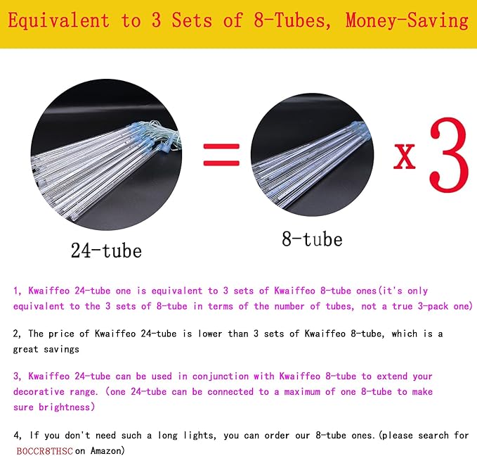 - 【Equivalent to 3 Sets of 8-Tubes, Money-saving】Our 24-tube meteor shower lights has 24 tubes, which is equivalent to 3 sets of Kwaiffeo 8-tube meteor shower lights in decorative effect, but the price is lower than 3 sets of 8-tube, which is a great savings. Note: they are only equivalent to the 3 sets of 8-tube in terms of the number of tubes, not a true 3-pack!
