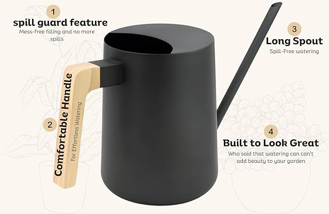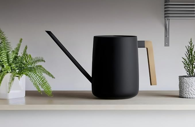 - STYLISH & FUNCTIONAL – No need to hide this watering can after use. Its modern, minimalist design complements any décor, making it a stylish addition to your space. With its sleek matte black body and genuine wooden handle, this watering can is as decorative as it is functional!