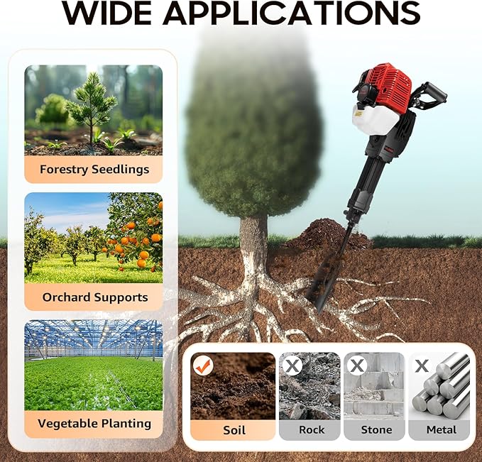 - 🌳52CC TWO STROKE TREE DIGGER: The tree hole digger adopts 2-stroke engine motor for smooth and stable performance with Low noise, providing 1900W Strong power, 3.5n.m large torque, and impact energy can reach 6500 rpm fast speed and 1500 times per minute with high impact capacity (20-55J), making your excavation work easier and fully meet your needs for efficiency