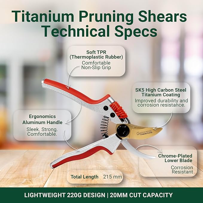 - Precision with Purpose – Crafted with high-carbon SK5 steel, these pruning shears feature dual chrome and titanium plating for exceptional durability and sharpness. Designed to deliver clean, smooth cuts, they support healthy plant growth across a variety of tasks—from trimming delicate flowers to cutting woody stems and small branches.