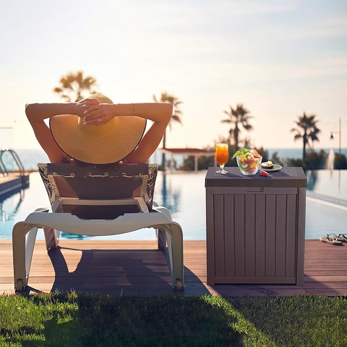 - Dimensions: Deck box’s overall dimensions: 22"L x 22" W x 24"H; with a 51 gallon storage capacity, this resin deck box provides plenty of space to store outdoor essentials such as tools, cushions, and pool accessories.