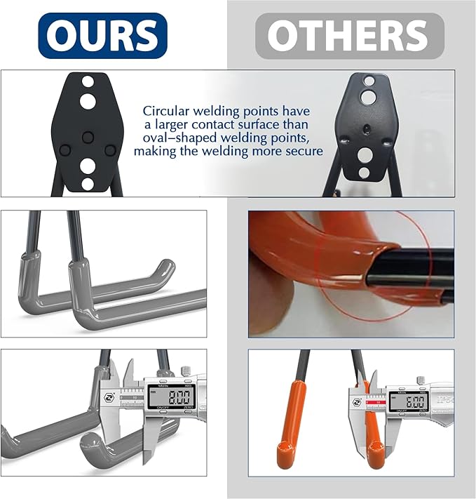 - Upgrade Design for Garage Wall Hooks: Different from other similar garden tool organizer with oval-shaped welding points, our designed circular welding points. These provide a larger contact surface between the hook and the backboard, offering higher security. We provide the most secure garage organizer in the market that means our bike hanger can bear more weight up to 42KG/92LB