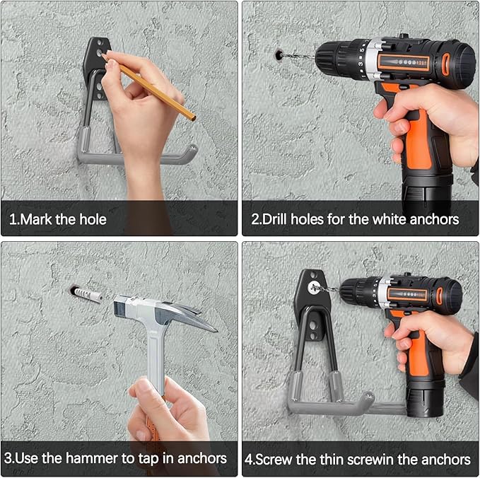 - Easy To Install: These heavy duty garage hooks are suitable for various walls. You can install them effortlessly. For plaster walls: (1) Insert black expansion screws into the two large holes of the ladder hanger; (2) Low speed drilling or manual tightening of steel screws. For wooden/brick/concrete walls: (1) Mark the two small holes for the garage tool hanger on the wall; (2) Drill holes and insert white expansion pipes; (3) Drill in steel screws