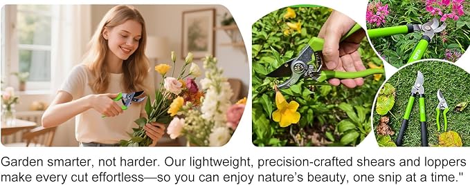 - All-in-One Garden Shears Set:Includes heavy duty loppers for tree trimming, durable pruning shears for plant care, and lightweight gardening scissors—ideal for flowers, shrubs, and small fruit trees.