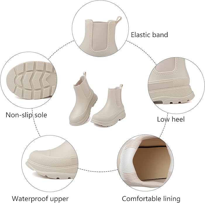 - Lightweight and comfy, keep you trendy in rain days. Roomy toe area and molded Insole for All Day Comfort, Inner elastic fabric edge finished, reduce rubbing discomfort at ankle.