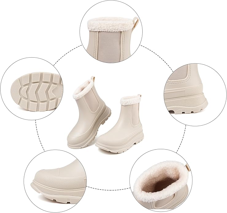 - Lightweight and comfy, keep you trendy in rain days. Roomy toe area and molded Insole for All Day Comfort, Inner elastic fabric edge finished, reduce rubbing discomfort at ankle.