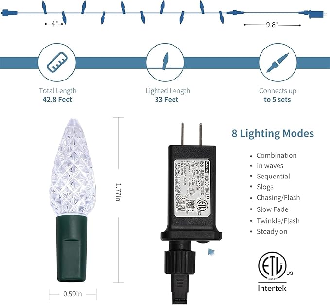 - [8 Modes Settings]: This Xmas decorative string light has 8 lighting modes for you to choose- combination, in waves, sequential, slogs, chasing/flash, slow fade, twinkle/flash, and steady on. Fit different occasions and environment, directly press the button on the transformer to change the modes
