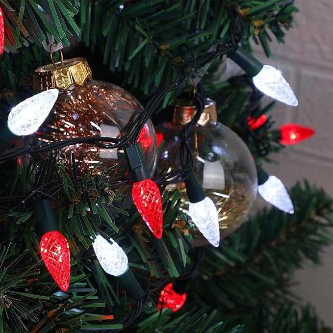 WATERGLIDE C6 Christmas Lights, 100 LED 33ft Faceted Fairy Lights Green Wire String Lights with Safe Adaptor, 8 Lighting Mode, Waterproof for Indoor Outdoor Patio Xmas Tree Party Decor, White & Red