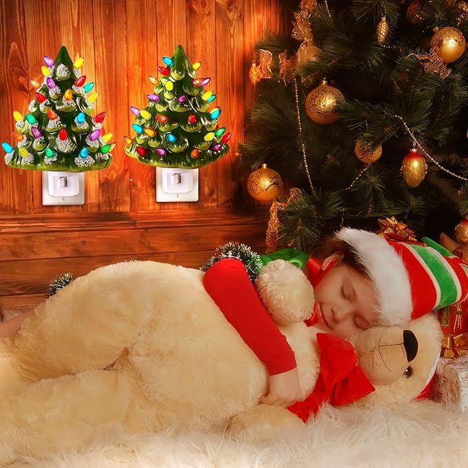 Tfro & Cile Ceramic Christmas Tree Night Light 2 Pack Xmas Decorative Tree Lamp Small Vintage Light Up Bathroom Decor with On/Off Switch for Home Bedroom
