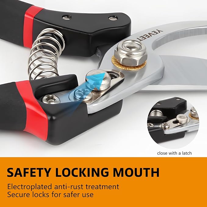- 【Safe and Convenient】: Our gardening hand tools are equipped with a safety lock design. Just push it gently to lock the scissors, allowing you to firmly close the blades when not in use, avoiding accidental injuries when carrying in a bag or when not in use. Shears gardening tools can be operated with one hand, making it safer and more convenient to use.