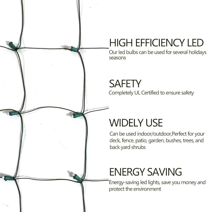 - 【Ideal Outdoor Christmas Net Lights】Our 5ftx5ft led net Christmas lights string has a length of 16.4ft in front lead and 1.64ft in rear lead, perfect outdoor indoor decorations for Christmas, Thanksgiving, Easter, Halloween, party, yard, balcony, garden, pergola, gazebo, especially for trees and bushes. The green wire grid can perfectly blend with bushes and trees, making your yard/garden look more natural during the day.