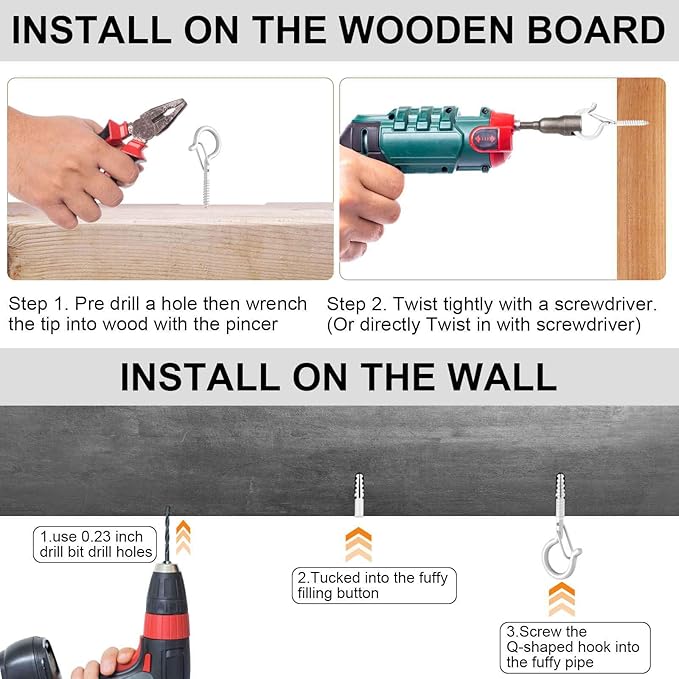 - Easy To Install - Come with plastic tubes, swivel hooks for hanging are easy to install all solid surface such as walls, ceiling, wooden beams, tree, fence, eaves etc. You can pre drill a hole then wrench the string light hooks outdoor directly in.