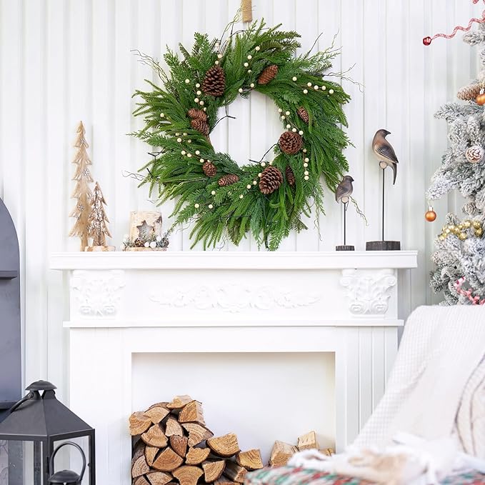 Prelit Christmas Wreaths for Front Door 24 Inch- Real Touch Norfolk Pine Wreath with Lights,Green Evergreen Outdoor Xmas Wreath with Natural Pine Cones and Berries for Farmhouse Home Decor